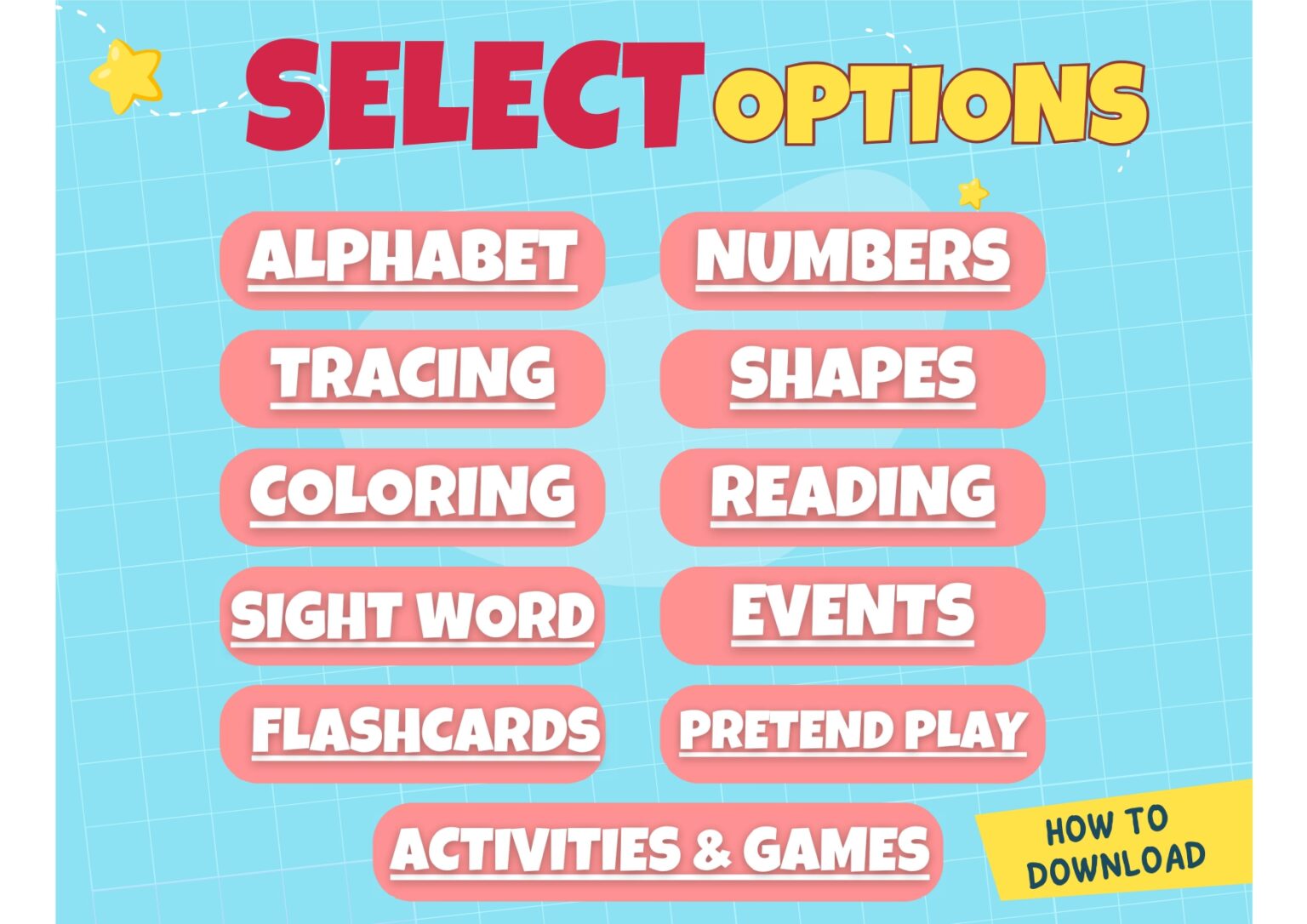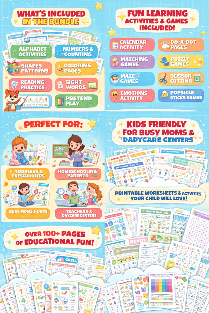 This bundle is designed for kids aged 2 to 7 years. The activities range from basic learning (alphabet, numbers, coloring) to more advanced skills like reading practice, puzzles, and problem-solving.